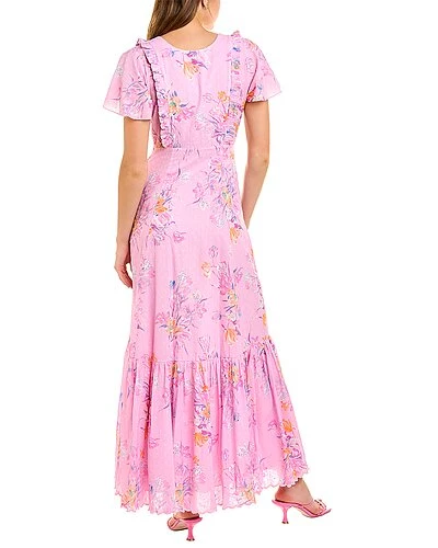 - Vinnie Dress in royal pink berry with Swiss dot design, V-neck, pleated ruffle trim, and shirred hem
