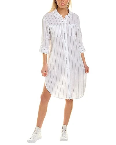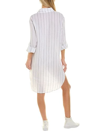 - Gauze Shirtdress in white with spread collar, dual chest pockets, dropped-shoulder sleeves, roll-up cuffs, and side slits at seams