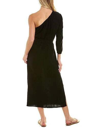 - One-Shoulder Tie Dress in black with blouson sleeve, elasticized cuff, and self-tie sash at waist