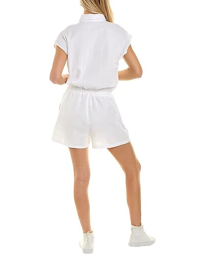 - Twill Pocket Romper in white with spread collar, extended shoulders, dual chest pockets, dual side on-seam pockets, and elasticized waistband