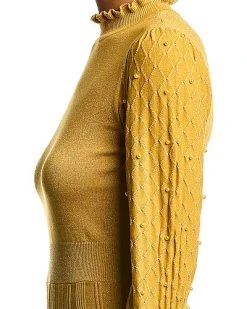 - Design details: ruffle mock neck, diamond stitch sleeves, ribbed trim, and pearl bead accents