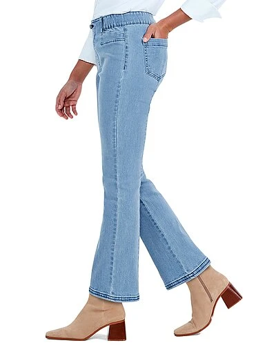 - Design details: denim, sits slightly below waist, pull on, boot leg, ankle length, patch pockets