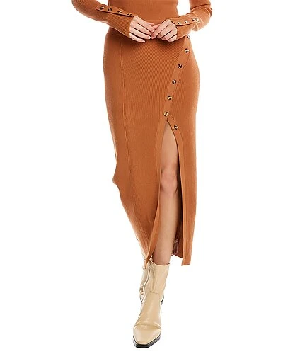 - Design details: ribbed knit, elasticized waist, asymmetrical button front and split front hem