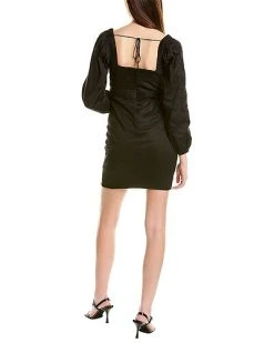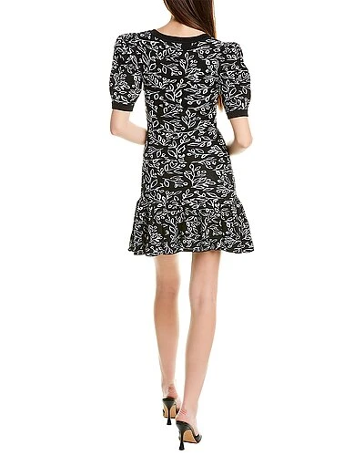 - Afternoon Shadows Mini Dress in black multicolor with square neckline, puff sleeves, ribbed trim and flounce hem