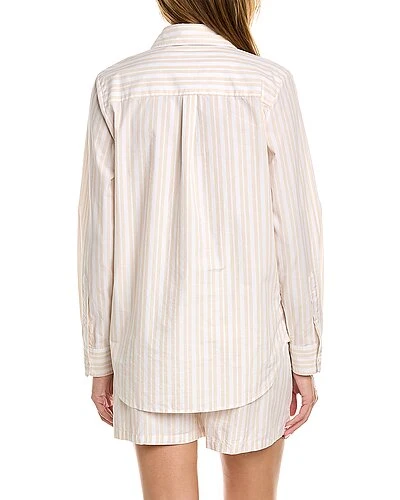 - Poplin Boyfriend Shirt in sand and white stripe with left chest pocket, barrel cuffs, box pleat at back, and high-low shirttail hem