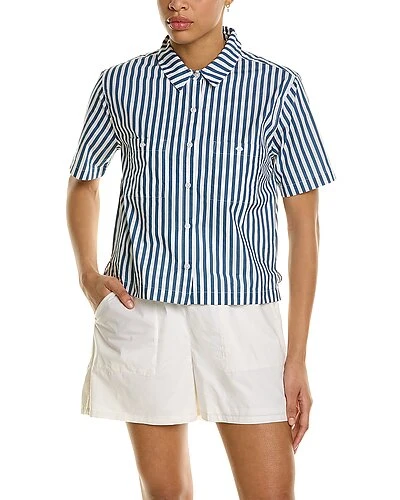 - Poplin Home Shirt in dark denim/white with spread collar, dual chest pockets and side slits at hem