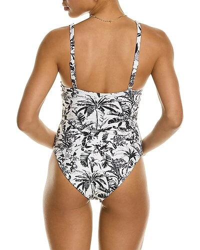 - Sylvie One-Piece in black multicolor with adjustable shoulder straps, white hardware and underwire support