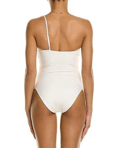 - Wren One-Piece in off white with ribbed fabric, one-shoulder style, adjustable shoulder strap and white hardware