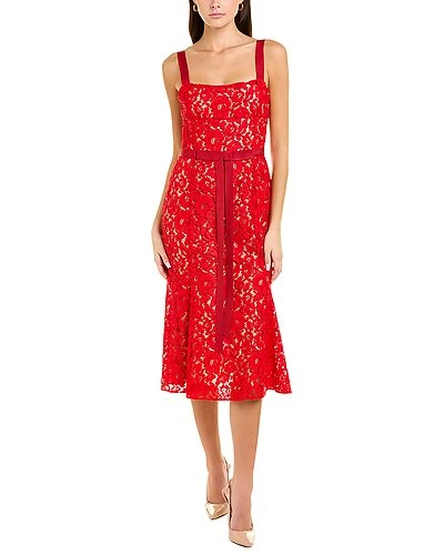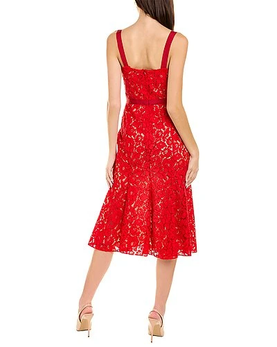 - Lace Midi Dress in cherrywith grosgrain shoulder straps and waist and flare hem