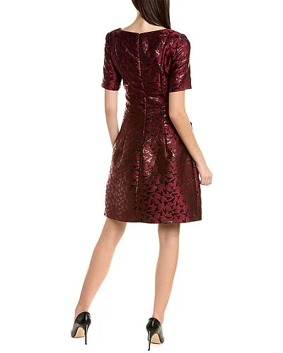 - Silk-Blend Midi Dress in berry and black combo with split neck, dropped waist, pleated skirt, and jacquard design