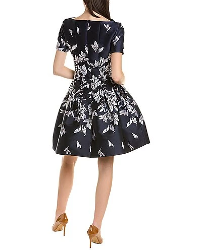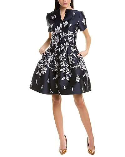- Silk-Blend Midi Dress in navy with split neck, dropped waist, pleated skirt, and embroidered design