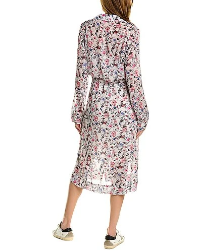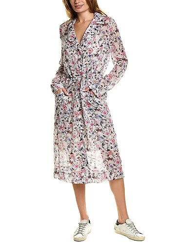 - Field Floral Dress in white multicolor floral with notch lapel, dual front pockets, and tie at waist