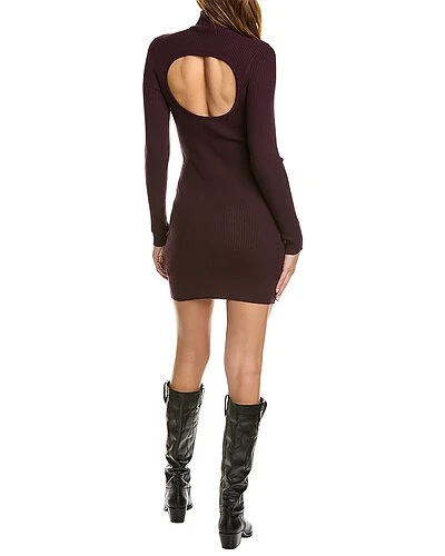 - Aspen Sweaterdress in raisin with ribbed design, mock neck, and open back