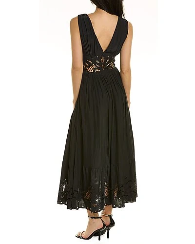 - Barb Maxi Dress in black with plunging neckline, crochet detailing at waist and hem, and gathered detailing