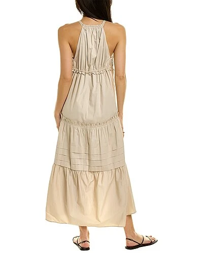 - Hester Maxi Dress in sandstone with pleated bodice, plunging neckline, pintuck details, and high-low hem