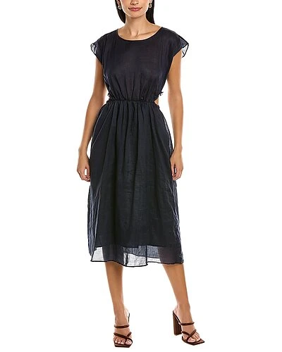 - Cap Sleeve Linen Midi Dress in navy with elasticized cutout waist and side seam pockets