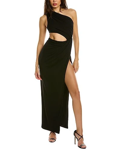 - Aido Maxi Dress in black with one-shoulder neckline, cutout waist and draped crossover skirt front
