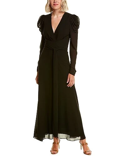 - Bernadette Maxi Dress in black with chiffon design, draped puff sleeves, detachable scarf detail, and accordion pleated front skirt