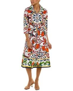 - Abel Shirtdress in majorca multicolor white multicolor with 3/4-length sleeves, side slip pockets, belted waist, and removable tie-sash