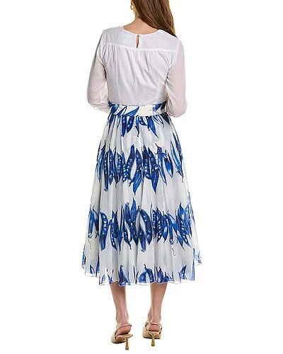 - Aster Midi Dress in white and blue sweet pea with 3/4-length sleeves, side seam pockets, removable belt, and tie sash