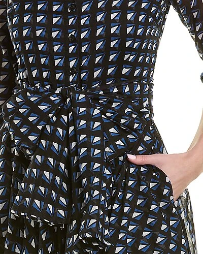 - Aster Shirtdress in kuba triangle black cobalt blue with 3/4-length sleeves, side slip pockets, belted waist, and removable tie-sash