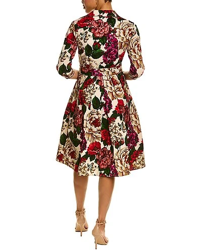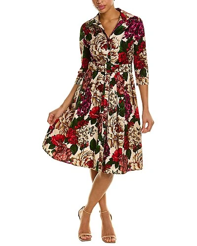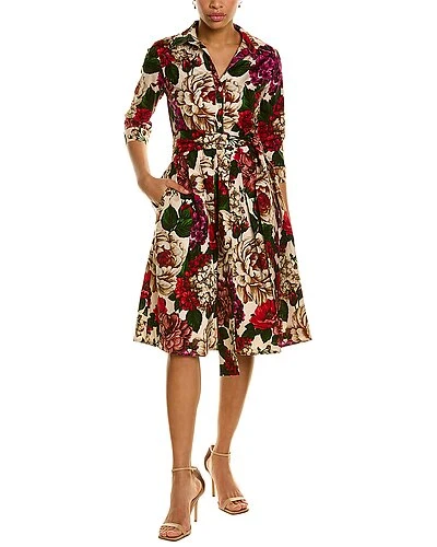 - Audrey 1 Shirtdress in flower a ivory pink with 3/4-length sleeves, pleated skirt, side seam pockets, belted waist, and tie-sash