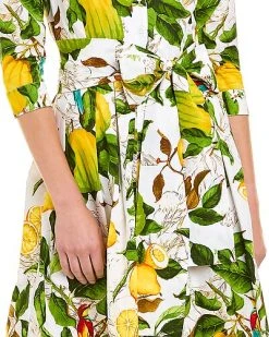 - Audrey 1 Shirtdress in yellow lemon Tuscany with 3/4-length sleeves, pleated skirt, side seam pockets, removable belt, and tie sash
