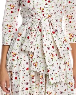- Audrey #2 Shirtdress in white red marta with spread collar, button cuffs, removable belt and self-tie sash, pleated skirt and dual side seam pockets