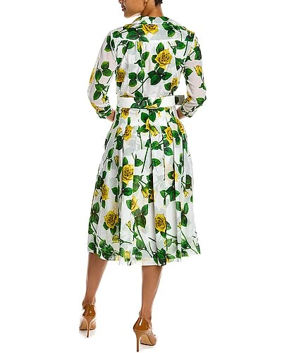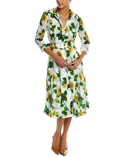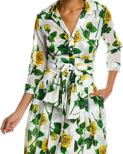 - Audrey 3 Shirtdress in white yellow riviera rose with 3/4-length sleeves, pleated skirt, side seam pockets, belted waist, and tie sash