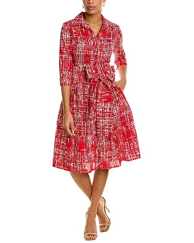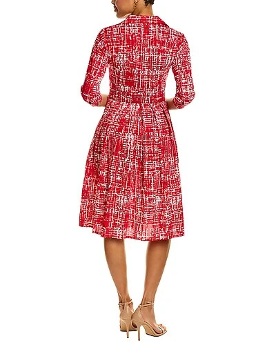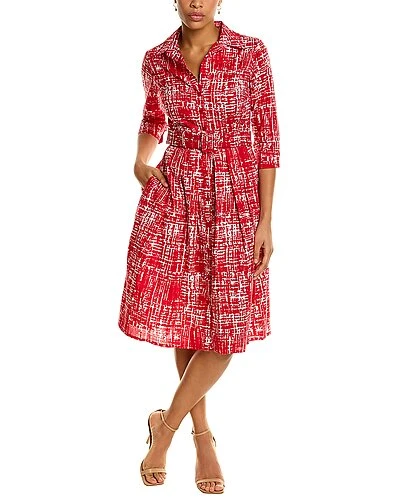 - Audrey 3 Shirtdress in hemp bouche red with 3/4-length sleeves, pleated skirt, side seam pockets, belted waist, and matching tie sash