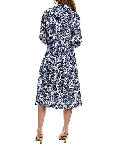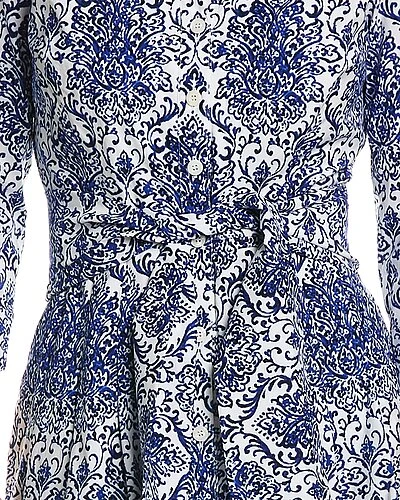 - Audrey 3 Shirtdress in white indigo kauffman ikat with 3/4-length sleeves, pleated skirt, side seam pockets, removable belt, and tie sash