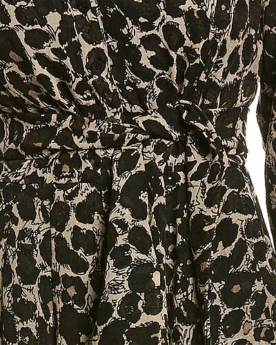 - Audrey 3 Wool Shirtdress in ivory and sepia graffiti leopard with 3/4-length sleeves, pleated skirt, side seam pockets, removable belt, and tie sash