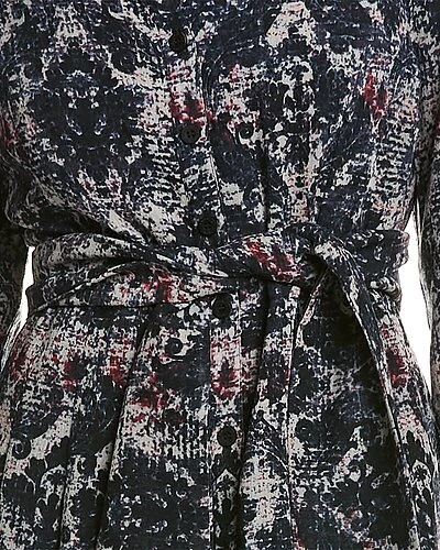 - Audrey 3 Wool Shirtdress in indigo tarnished rug dark with 3/4-length sleeves, pleated skirt, side seam pockets, removable belt, and tie sash