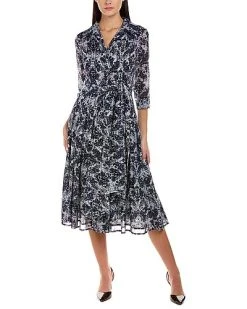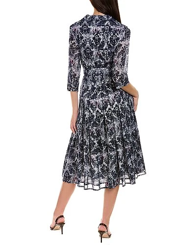 - Audrey 4 Shirtdress in indigo tarnished rug with 3/4-length sleeves, pleated skirt, side slip pockets, belted waist, and removable tie-sash