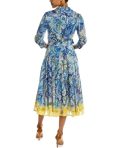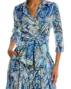- Audrey 4 Shirtdress in blue indie paisley with 3/4-length sleeves, pleated skirt, side seam pockets, belted waist, and tie sash