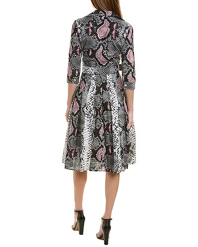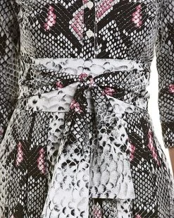 - Audrey 4 Shirtdress in python new contrast black nude with 3/4-length sleeves, pleated skirt, side slip pockets, belted waist, and removable tie-sash