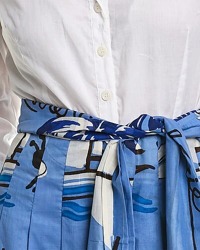 - Audrey Contrast Midi Shirtdress in soft sky blue riviera cherie with Blouse top, 3/4-length sleeves with button cuff, pleated skirt with side seam pocket, belt and sash included