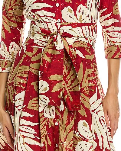- Audrey D #3 Shirtdress in red ohau hibiscus with spread collar, pleated skirt, dual side on-seam pockets, and removable belt
