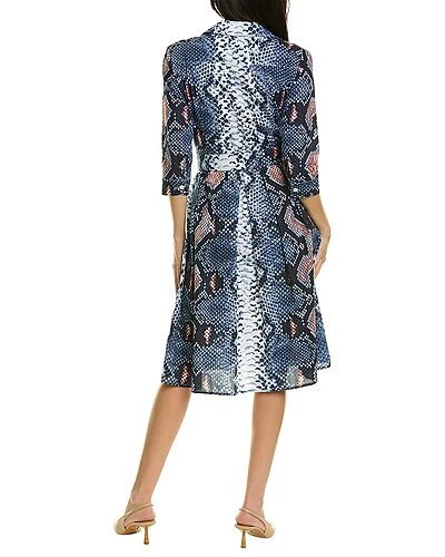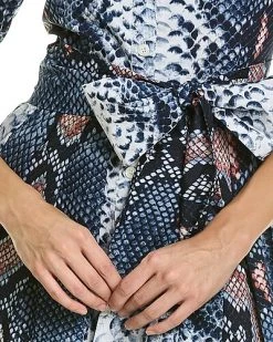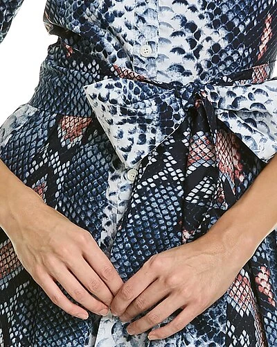 - Audrey Shirtdress in python new contrast indigo orange with spread collar, 3/4-length sleeves, button cuffs, pleated skirt, dual side on-seam pockets, self-tie sash at waist, and removable belt