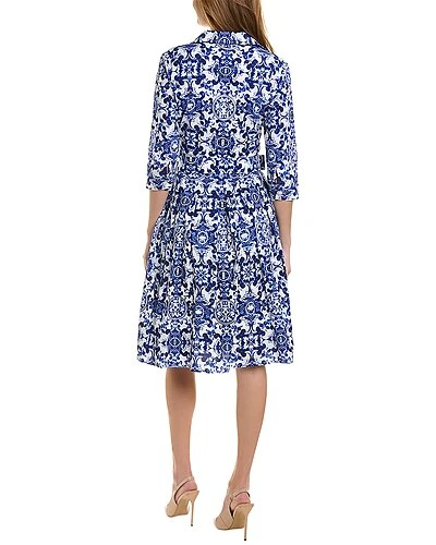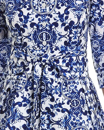 - Audrey Shirtdress in ibiza sintra tile white cobalt with spread collar, 3/4-length sleeves, button cuffs, pleated skirt, dual side on-seam pockets, self-tie sash at waist, and removable belt