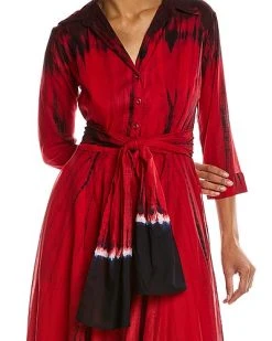 - Avenue Shirtdress in red with 3/4-legnth sleeves, side seam pockets, tie sash, and belted waist