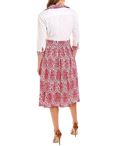 - Avery Shirtdress in white and rose Kauffman ikat with 3/4-length sleeves, pleated skirt, side seam pockets, and removable belt