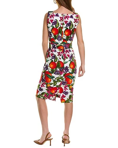 - Celine Sheath Dress in white tuscani arancia with square neckline, belted waist and center vent at back hem