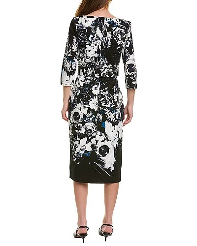 - Celine Sheath Dress in black and blue noir flower with square neck, 3/4-length sleeves, center back vent, and matching belt