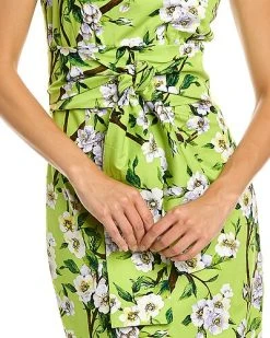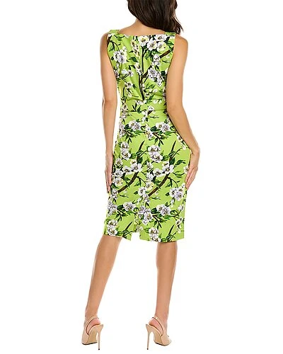 - Celine Sheath Dress in apple green wood rose with baotneck, self-tie sash at waist, removable belt, and vented back hem