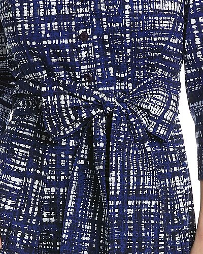 - Patricia Shirtdress in cobalt blue hemp linen with 3/4-length sleeves, pleated skirt, side seam pockets, removable belt, and tie sash