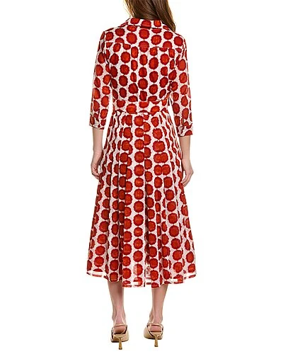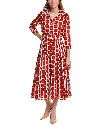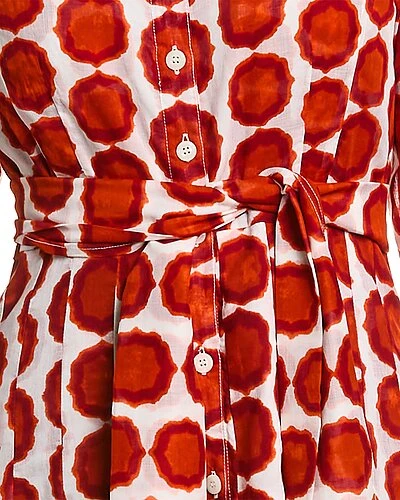 - Patricia Shirtdress in white orange medallion ikat with 3/4-length sleeves, pleated skirt, side seam pockets, removable belt, and tie sash