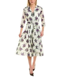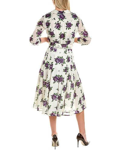 - Patricia Shirtdress in common rose ivory ivory lilac with spread collar, button cuffs, belted waist, pleated skirt and dual side seam pockets