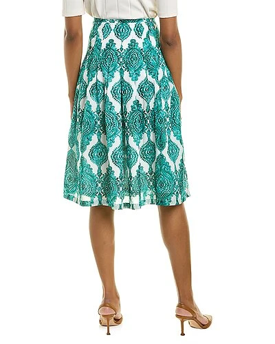 - Zelda Midi Skirt in damascus wallpaper white turquoise with pleated design and two front pockets