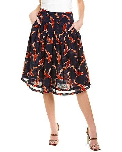 - Zelda Midi Skirt in trout schubert indigo orange with pleated design and two front pockets